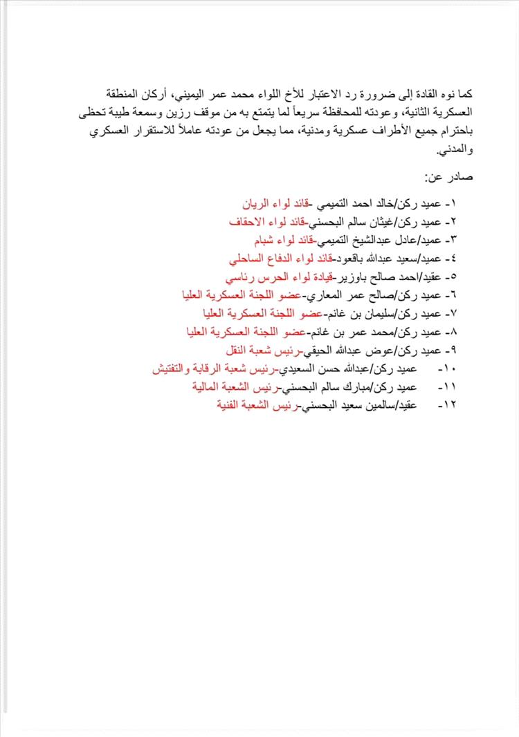 ودعا البيان إلى إعادة الاعتبار للواء محمد عمر اليميني، أركان المنطقة العسكرية الثانية، وعودته إلى ممارسة مهامه، باعتباره شخصية عسكرية مشهوداً لها بالكفاءة والاحترام داخل المؤسسة العسكرية في حضرموت.