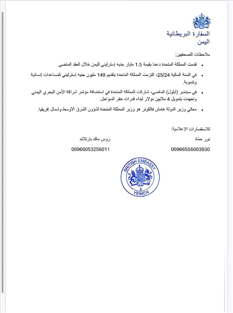 أكد بيان صادر عن السفارة البريطانية في اليمن أن معالي وزير الدولةالبريطاني لشؤون الشرق الأوسط وشمال أفريقيا، اللورد هيمش ماكلكلين، جدد خلال زيارته لليمن التأكيد على قوة الشراكة بين المملكة المتحدة والحكومة اليمنية، والتزام بلاده بدعم برامج النمو والتنمية والاستجابة الإنسانية في البلاد.