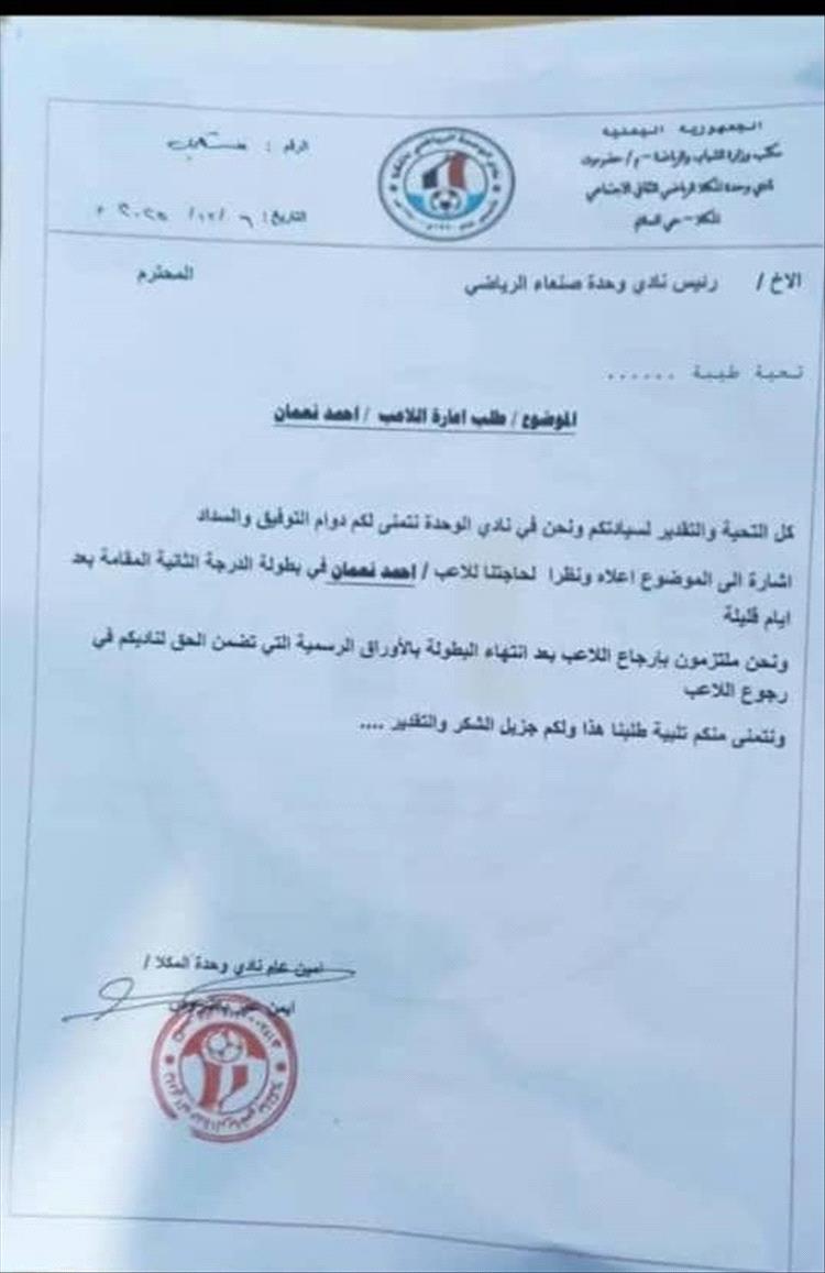 نعم سأشارك في دوري الدرجة الثانية المقامة هناك مع فريق وحدة المكلا على سبيل الاعارة حسبما تم الاتقاق مع ادارة فريقي وحدة صنعاء وبعد انتهاء الدوري هناك ساعود الى فريقي وهذا كان بتوجيهات ادارة الفريق واتحاد الكرة ..