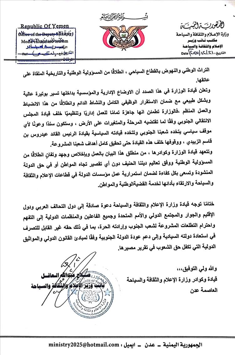 أصدرت وزارة الإعلام والثقافة والسياحة بيان تأييد صادر عن قيادتها وكوادرها في العاصمة عدن، أكدت فيه تأييدها التام والداعم للقرارات التاريخية الأخيرة التي صاغها بإرادته الحرة شعب الجنوب، وأعلنت عنها وطبقتها بكل حزم وحكمة القيادة السياسية، ممثلة بفخامة الرئيس القائد عيدروس قاسم الزُبيدي، رئيس المجلس الانتقالي الجنوبي، القائد الأعلى للقوات المسلحة الجنوبية، ونوابه في القيادة السياسية (بحسب نص البيان).