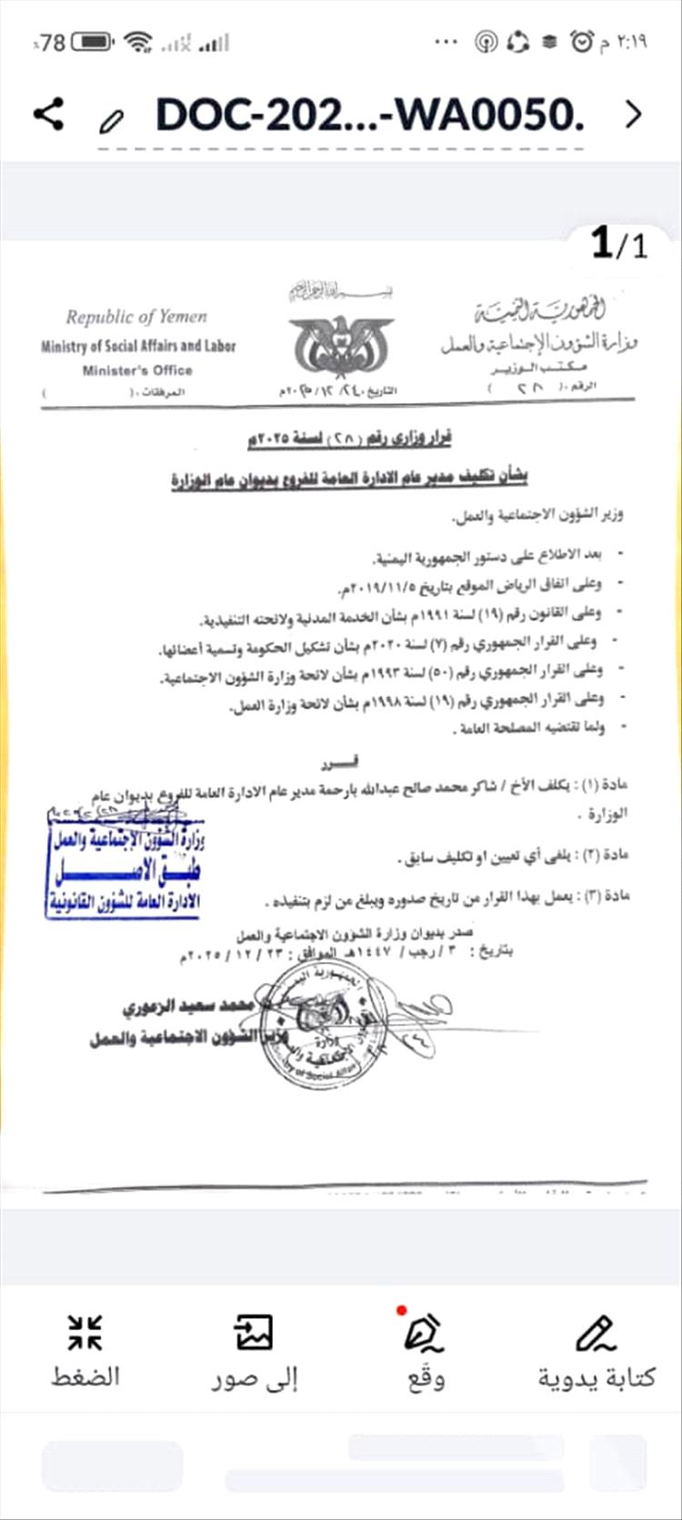 صدر قرار وزاري رقم (21) لسنة 2025م عن وزير الشؤون الاجتماعية والعمل، قضى بـ تكليف الأخ/ شاكر محمد صالح عبدالله بارحمة بأعمال مدير عام الإدارة العامة للفروع بديوان عام الوزارة.