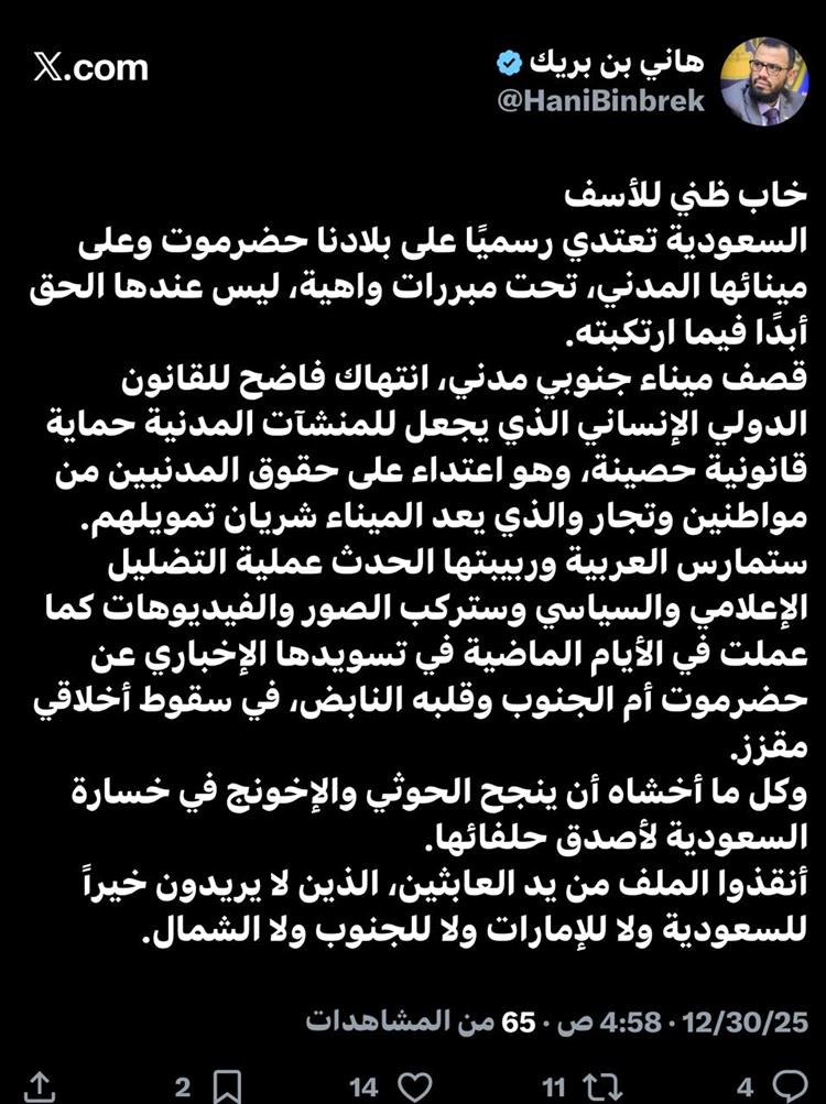 قال هاني بن بريك، القيادي في المجلس الانتقالي الجنوبي، إن السعودية “تعتدي رسميًا على بلادنا حضرموت وعلى مينائها المدني”، معتبرًا أن ما جرى لا يستند إلى أي مبررات مشروعة، ويمثل اعتداءً واضحًا لا تملك الرياض الحق في ارتكابه.