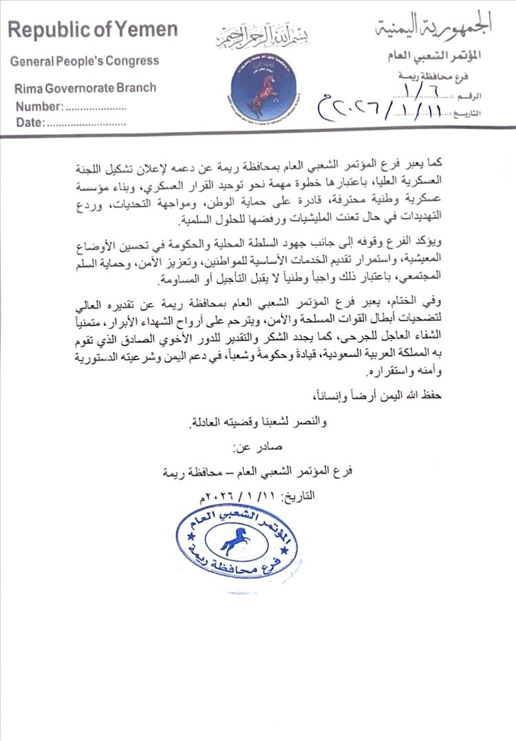 كما يعبر فرع المؤتمر الشعبي العام بمحافظة ريمة عن دعمه لتشكيل اللجنة العسكرية العليا، باعتبارها خطوة مهمة نحو توحيد القرار العسكري، وبناء مؤسسة عسكرية وطنية محترفة، قادرة على حماية الوطن، ومواجهة التحديات، وردع التهديدات في حال تعنت المليشيات ورفضها للحلول السلمية.