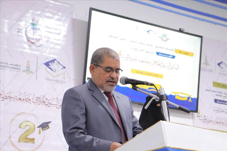 وأكد أن الجامعة تولي اهتمامًا مستمرًا بخلق الشخصية المتكاملة للخريج من خلال تنظيم ورعاية الأنشطة الطلابية المتنوعة؛ لصقل مواهب الطلاب وإبداعاتهم، لافتًا إلى أن الجامعة تنظم سنويًّا أسابيع للجودة والبحث العلمي وخدمة المجتمع والطلاب. وقال إن خريجي جامعة حضرموت ضربوا أروع الأمثلة عندما واصلوا الدراسات العليا في مختلف دول العالم، وإن كثيرًا منهم تفوقوا على أقرانهم في تلك الجامعات.