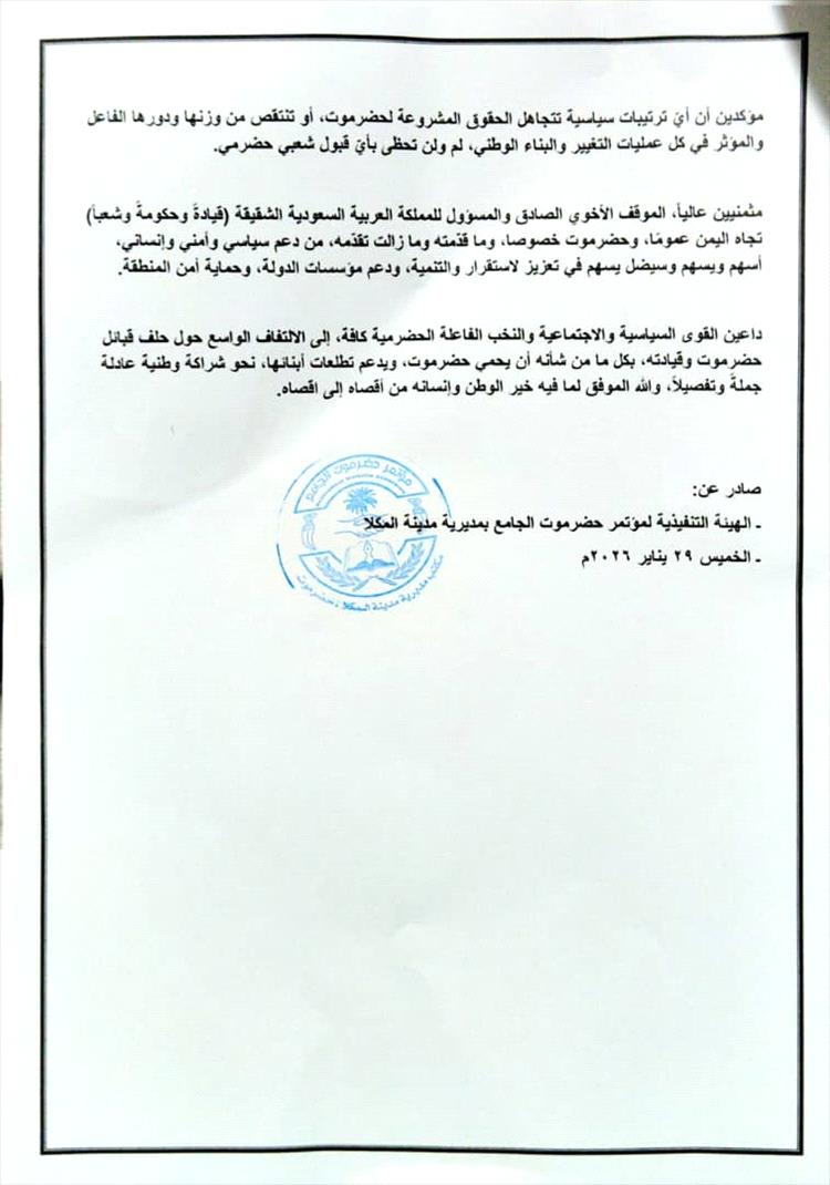 وعلى ما تقدّم فأننا نؤكد في ختام بياننا هذا، أن حضرموت اليوم، تستحق لنفسها مسارًا سياسيًا مستقلًا يضمن لها وابنائها الأبرار في الداخل والخارج، تمثيلاً عادلاً في أي تسوية وطنية قادمة، ويكفل لها دورًا فاعلًا في صناعة القرار وإدارة المرحلة الراهنة والمستقبلية بكل ما لديها من كفاءات وكفايات وطنية سياسية ومهنية تستطيع بجدارة المقتدر على المضي بها صوب غدها المنشود وآتيها الوضاء ومستقبلها الزاهر، مؤكدين أن أيّ ترتيبات سياسية تتجاهل الحقوق المشروعة لحضرموت، أو تنتقص من وزنها ودورها الفاعل والمؤثر في كل عمليات التغيير والبناء الوطني، لم ولن تحظى بأيّ قبول شعبي حضرمي.