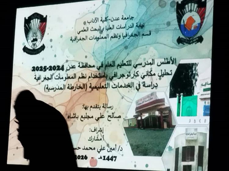 (الأطلس المدرسي للتعليم العام في محافظة عدن 2024–2025: تحليل مكاني كارتوغرافي باستخدام نظم المعلومات الجغرافية – دراسة في الخدمات التعليمية الخرائط المدرسية )، وذلك في المناقشة العلمية التي عُقدت صباح الخميس الموافق 29/01/2026م بقاعة الدراسات العليا – كلية الآداب، جامعة عدن.