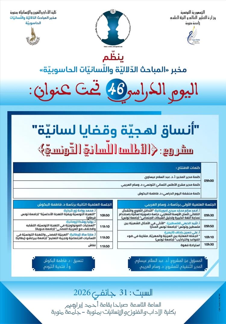 نظّم مخبر المباحث الدلاليّة واللّسانيّات الحاسوبيّة، يوم أمس الأول السبت 31 يناير 2026، بكلّية الآداب والفنون والإنسانيّات بمنّوبة (تونس)، يومًا دراسيًّا بعنوان : أنساق لهجيّة وقضايا لسانيّة، وذلك في إطار سلسلة اللقاءات العلميّة المرتبطة بـ مشروع الأطلس اللّسانيّ التونسيّ، وهو مشروع علمي يهدف إلى إنجاز قاموس لهجيّ خاصّ باللهجة التونسيّة، يتميّز بالاختلاف نوعًا وكمًّا وعلى مستوى منهجيّة العمل وطريقة العرض، مقارنة بالأعمال المعجميّة السابقة.