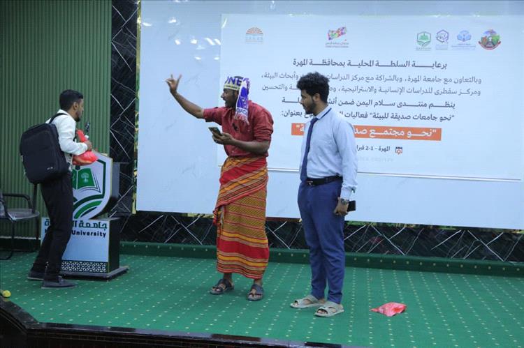 وأكد نائب رئيس جامعة المهرة للشؤون الأكاديمية الدكتور فائز جمعان بن مركب أن الجامعة تولي قضايا البيئة اهتمامًا بالغًا، انطلاقاً من مسؤوليتها الأكاديمية والمجتمعية، مشيراً إلى أن قيادة الجامعة، ممثلة برئيسها معالي الدكتور أنور محمد كلشات، اتخذت خطوات عملية لتعزيز الممارسات البيئية السليمة، وفي مقدمتها صدور القرار رقم (85) لعام 2025م، بتاريخ 15 ديسمبر 2025م، القاضي بحظر إدخال أو استخدام الأكياس البلاستيكية أحادية الاستخدام داخل الحرم الجامعي، وإلزام المرافق والمحال والكافيتريات باستخدام بدائل بيئية آمنة قابلة للتحلل وإعادة التدوير، مع تكليف مركز الدراسات والبحوث وأبحاث البيئة بمتابعة تنفيذ القرار.
