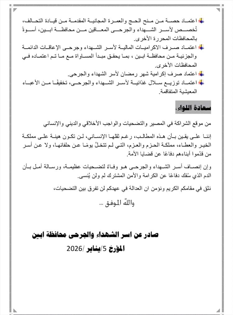 صادر عن: أسر الشهداء والجرحى – محافظة أبين