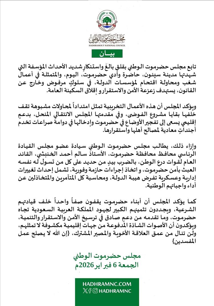 وطالب مجلس حضرموت الوطني عضو مجلس القيادة الرئاسي محافظ محافظة حضرموت، الأستاذ سالم أحمد الخنبشي، القائد العام لقوات درع الوطن، باتخاذ إجراءات حازمة وفورية والضرب بيد من حديد على كل من يحاول العبث بأمن حضرموت، بما في ذلك إحداث تغييرات إدارية وعسكرية تفرض هيبة الدولة ومحاسبة المتآمرين والمتخاذلين عن أداء واجباتهم الوطنية.