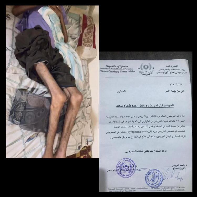 وأوضح علاء أن شقيقه هديل، البالغ من العمر 33 عامًا، يعاني من عدة أورام منتشرة في الجسم، شملت الرئة والطحال والبطن، مشيرًا إلى أن حالته الصحية تدهورت مؤخرًا، الأمر الذي استدعى توصية الطبيب المعالج بسرعة نقله إلى الخارج لاستكمال العلاج وإجراء تدخل جراحي عاجل.