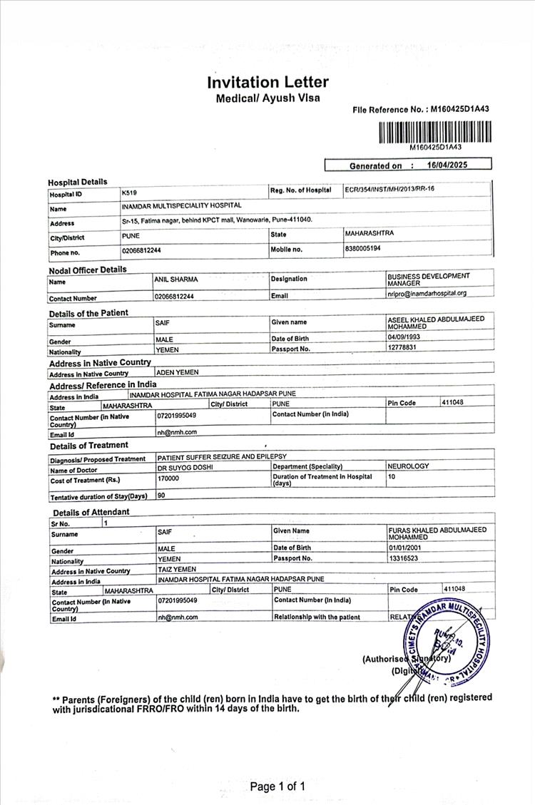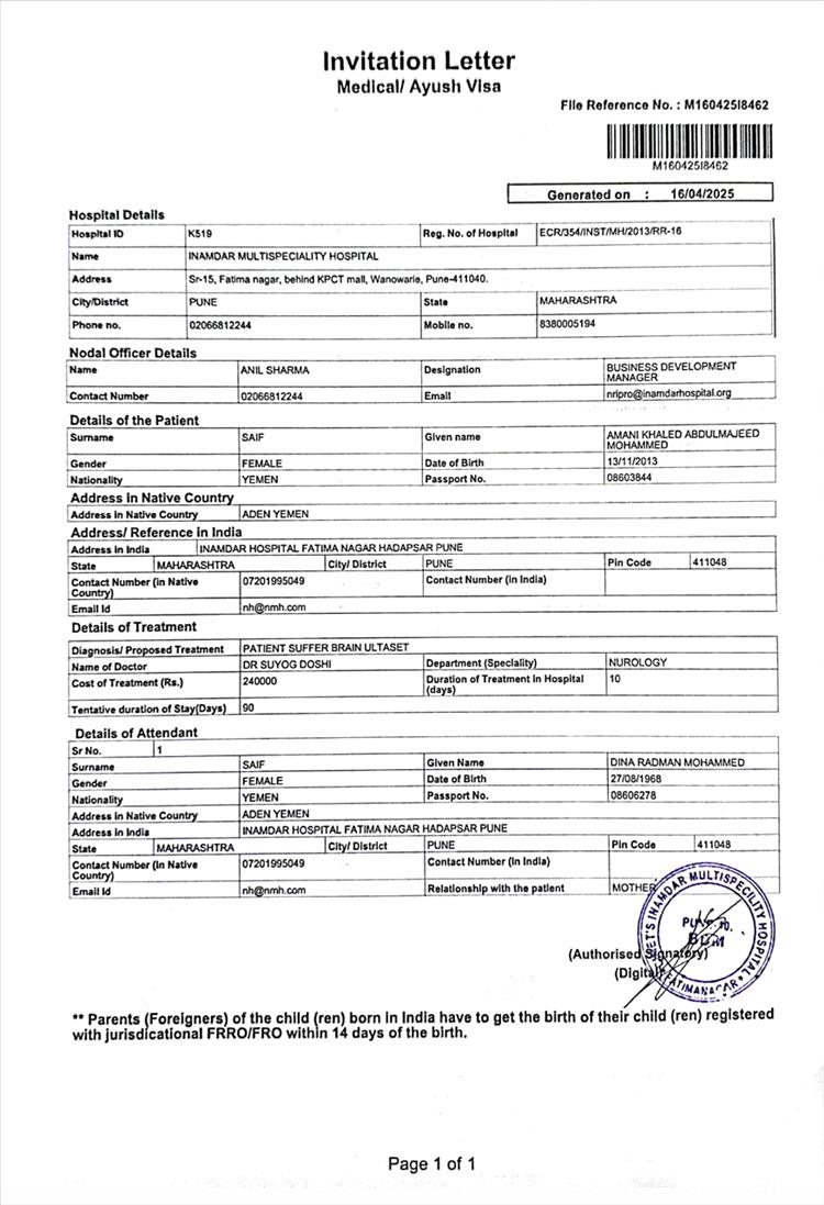 وأوضحت الوالدة في مناشدتها أنها تمكنت بفضل الله ثم بمساندة أحد فاعلي الخير من تأمين تكاليف العملية الجراحية المقررة لابنتها في دولة الهند، بالإضافة إلى قيمة تأشيرات السفر والتذاكر، إلا أنها تقف عاجزة اليوم أمام توفير مصاريف المعيشة وإيجار السكن وأجرة المترجم المرافق لهما، والتي تُقدر بنحو خمسة آلاف دولار أمريكي، مشيرة إلى أن موعد السفر المقرر لم يتبقَّ عليه سوى عشرة أيام فقط من تاريخ نشر هذه المناشدة في هذه الأيام المباركة من شهر رمضان الفضيل.