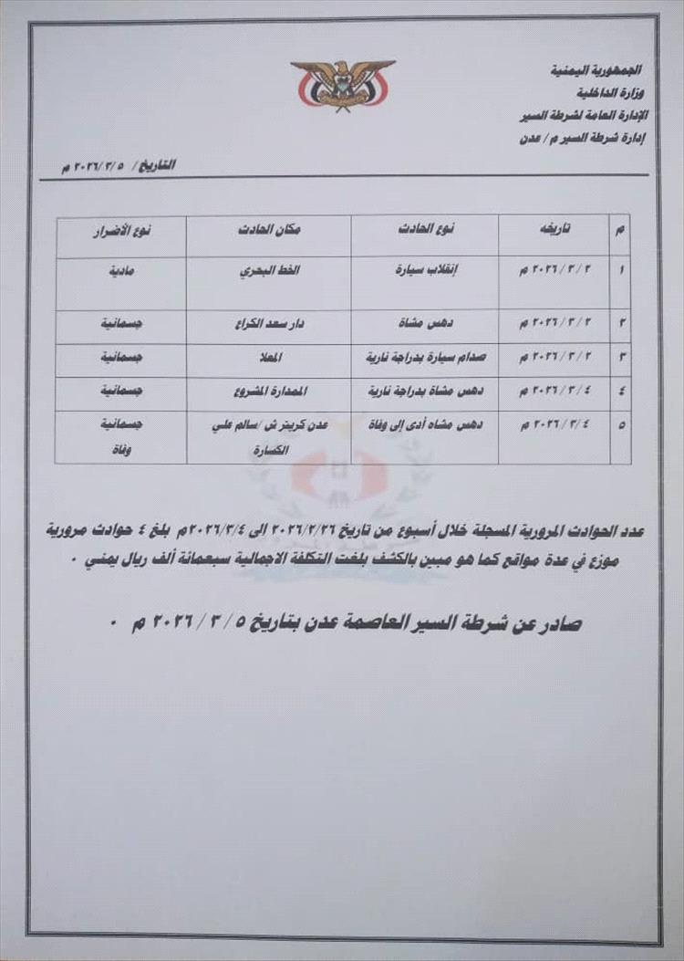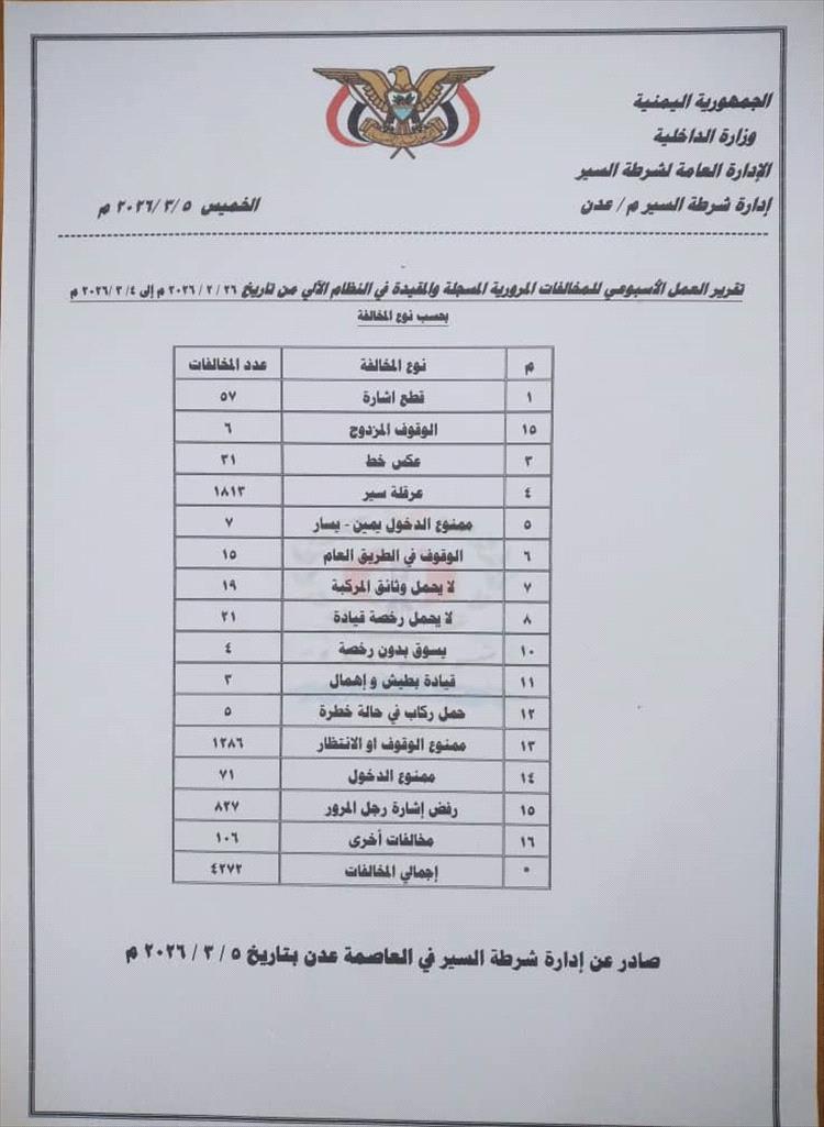 أصدرت إدارة شرطة السير بالعاصمة عدن تقريرها الأسبوعي للمخالفات والحوادث المرورية المسجلة خلال الفترة من ٢٦ فبراير ٢٠٢٦م حتى ٤ مارس ٢٠٢٦م حيث بلغ عدد المخالفات المرورية ٤٢٧٢ مخالفة في مختلف مديريات العاصمة.