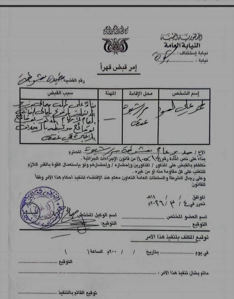 كما أظهرت الوثائق صورة من أمر القبض الصادر عن النيابة العامة، متضمنة بيانات الشخص المطلوب ضبطه ومكان إقامته في محافظة شبوة، مع توجيهات للأجهزة الأمنية بتنفيذ أمر القبض وإحضاره وفق الإجراءات القانونية المعمول بها.