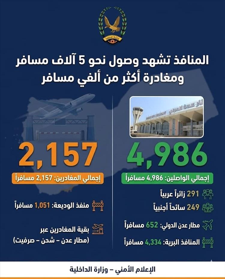 وفي المقابل، بلغ عدد المغادرين عبر مطار عدن الدولي ومنافذ الوديعة وشحن وصرفيت البرية 2157 مسافراً، منهم 1051 مسافراً غادروا عبر منفذ الوديعة البري.