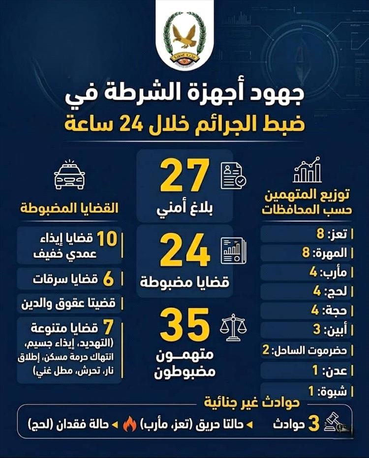 وبحسب تقارير تلقتها الإدارة العامة للقيادة والسيطرة من إدارات الشرطة بالمحافظات، فقد تم ضبط 35 متهماً، توزعوا على عدد من المحافظات، بواقع 8 متهمين في تعز ومثلهم في المهرة، و4 متهمين في كل من مأرب ولحج وحجة، و3 متهمين في أبين، ومتهمين اثنين في حضرموت الساحل، ومتهم واحد في كل من عدن وشبوة.