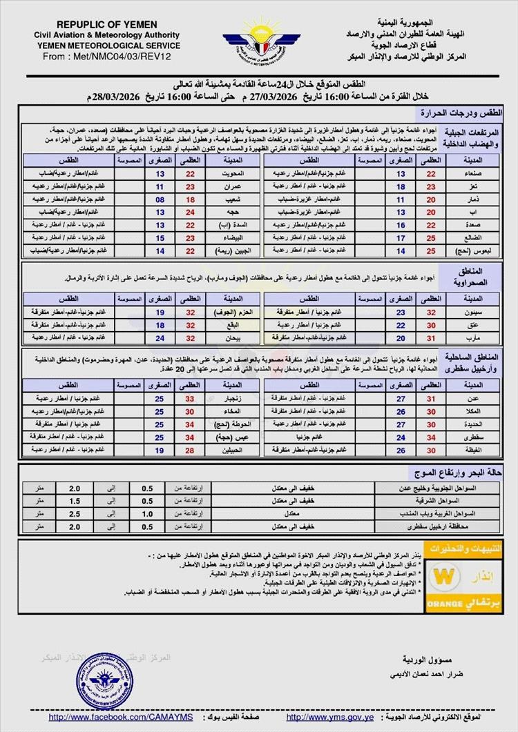 توقع المركز الوطني للأرصاد الجوية هطول أمطار غزيرة إلى شديدة الغزارة، مصحوبة بعواصف رعدية، على أجزاء واسعة من اليمن يوم غدٍ السبت 28 مارس، في موجة جوية يُرجح أن تكون من الأشد خلال الفترة الحالية.