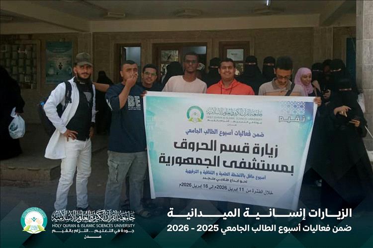 في إطار فعاليات أسبوع الطالب الجامعي، نظّمت جامعة القرآن الكريم والعلوم الإسلامية – عدن سلسلة من الزيارات الإنسانية بمشاركة فاعلة من الطلاب والطالبات، وذلك في إطار ترسيخ قيم التكافل الاجتماعي وتعزيز الدور المجتمعي للطالب الجامعي.