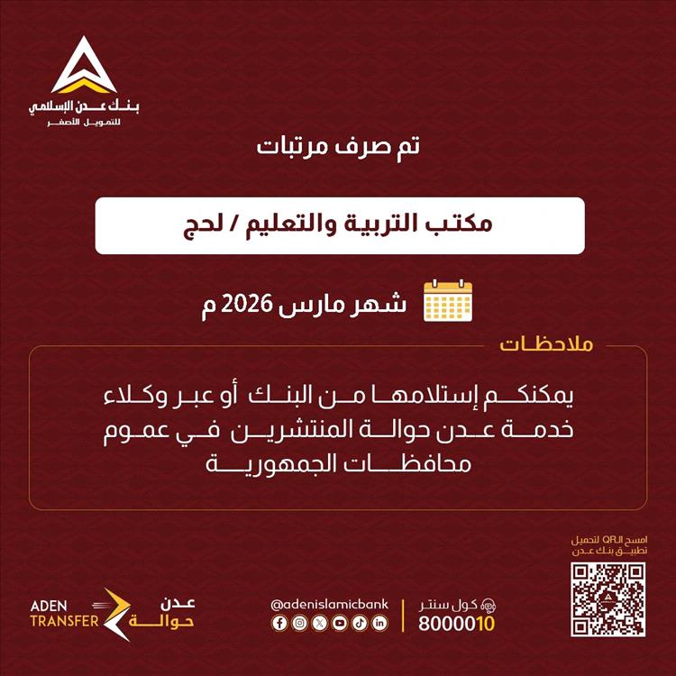 أعلن بنك عدن الإسلامي للتمويل الأصغر، اليوم الأحد، بدء صرف مرتبات المعلمين في محافظات عدن وأبين ولحج لشهر مارس 2026م.