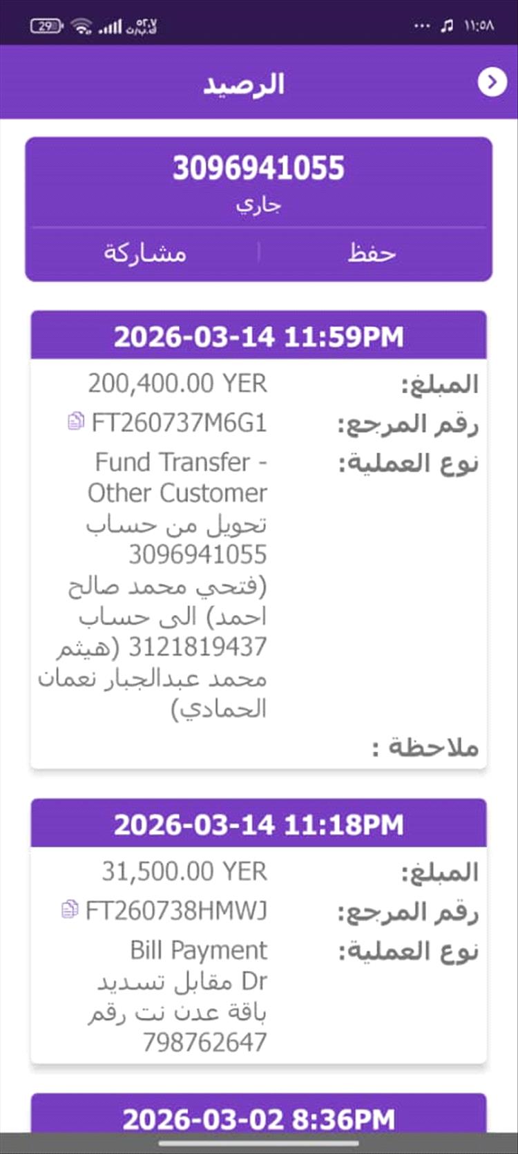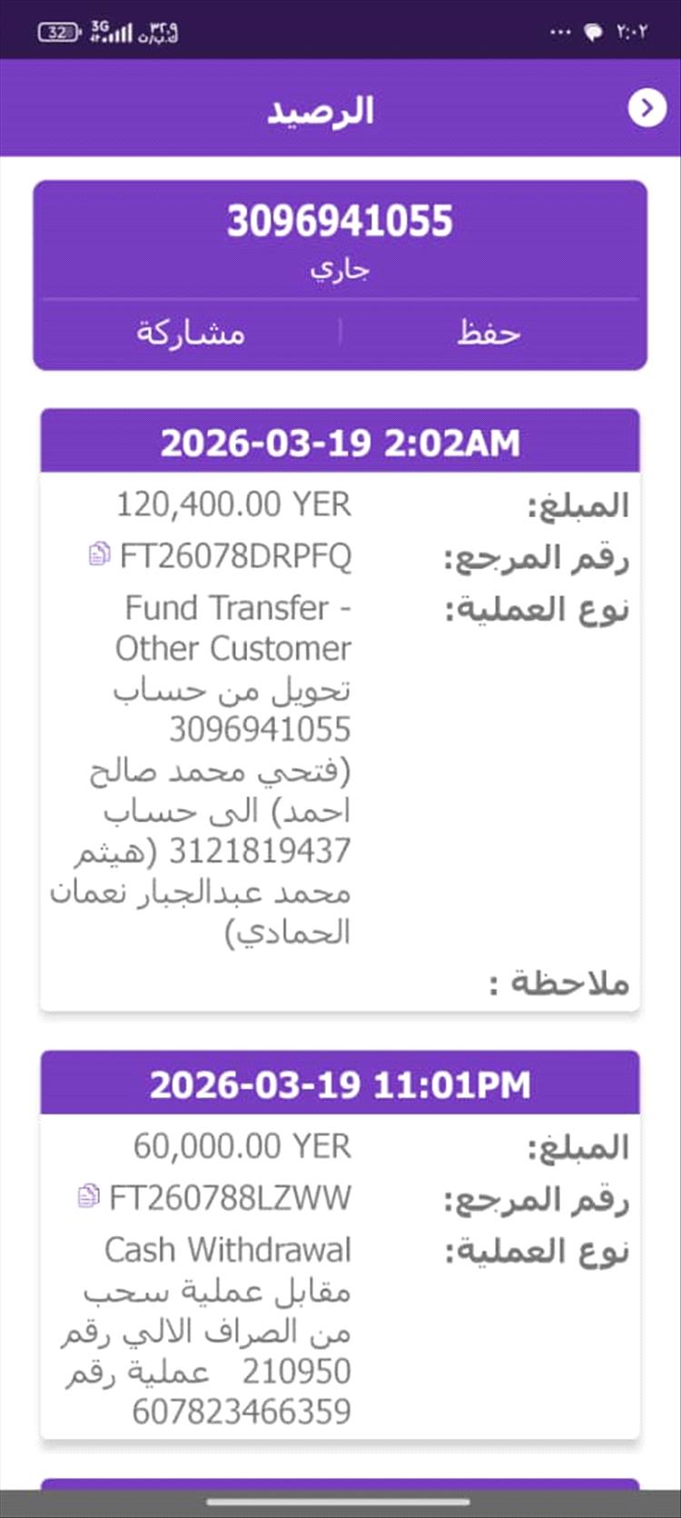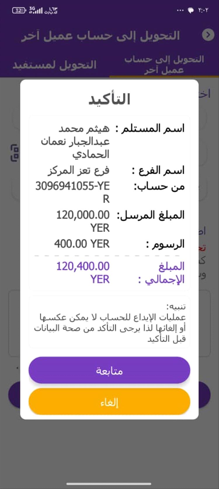 وأوضح السيسي أنه قام بتحويل الدفعة الأولى وقدرها 200 ألف ريال عبر "بنك الكريمي" إلى حساب شخص يدعى (هيثم محمد عبدالجبار نعمان الحمادي) بتاريخ 14 مارس 2026م، ثم أتبعها بإيداع مبلغ 120 ألف ريال لحساب الشخص نفسه بتاريخ 19 مارس 2026م.