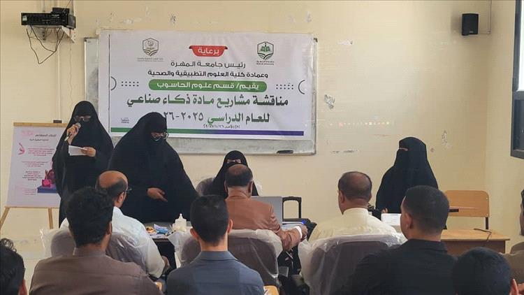 دشن نائب رئيس جامعة المهرة للشؤون الأكاديمية الدكتور فائز جمعان بن مركب، اليوم، مناقشة مشاريع مادة الذكاء الاصطناعي لطلبة المستوى الثالث بقسم علوم الحاسوب، بكلية العلوم التطبيقية والصحية، وذلك برعاية رئيس الجامعة وعمادة الكلية، وفي إطار اهتمام الجامعة بتطوير المشاريع الطلابية وربطها باحتياجات المجتمع.