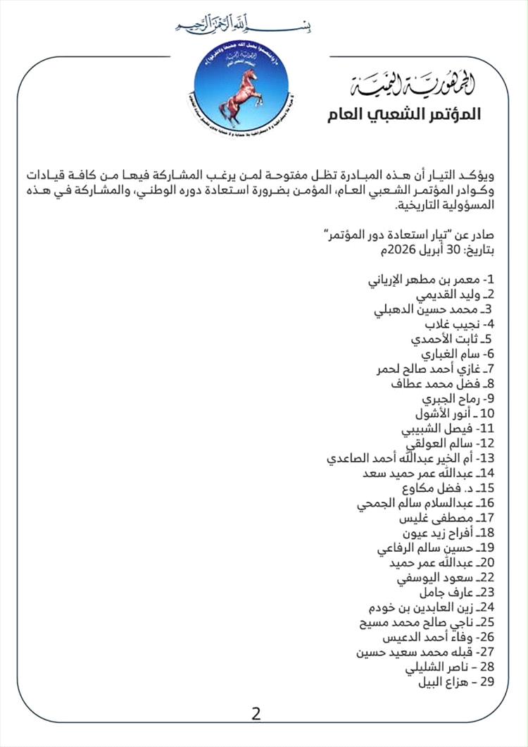 وأكد القائمون على التيار أن هذه المبادرة تظل مفتوحة أمام كافة قيادات وكوادر المؤتمر الشعبي العام الراغبين في المشاركة، باعتبارها خطوة نحو استعادة الدور التاريخي للحزب، والمساهمة في معالجة التحديات الراهنة التي تواجه البلاد.